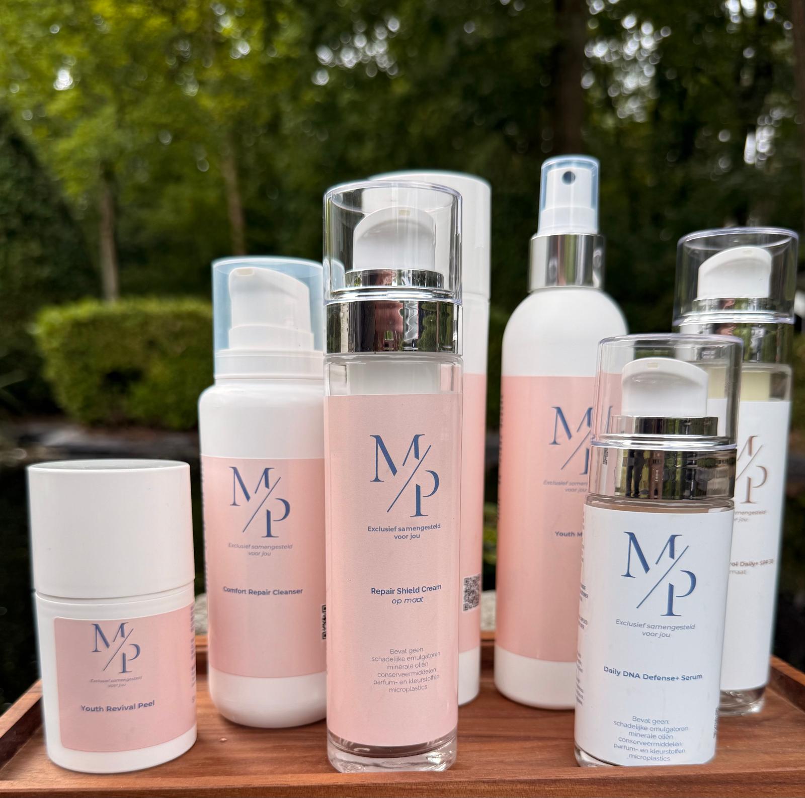 MP staat voor Mijn Product – letterlijk. Elk potje wordt gepersonaliseerd na een professionele huidanalyse en op maat bereid met ingrediënten die jouw huid op dat moment nodig heeft. Volledig natuurlijk, huid-identiek en vrij van alles wat je huid kan belasten.